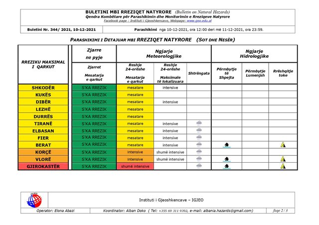 “Sipas llogaritjeve të IGJEO, sot priten reshje intensive, të cilat do të jenë më të përqendruara në jug të territorit. Në qarqet Berat, Vlorë dhe Gjirokastër mund të ketë vërshime të shpejta të lumenjve të vegjël malorë dhe rrëshqitje të dherave.